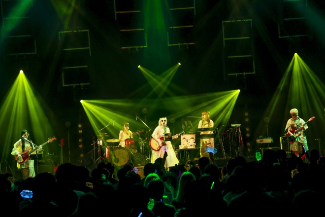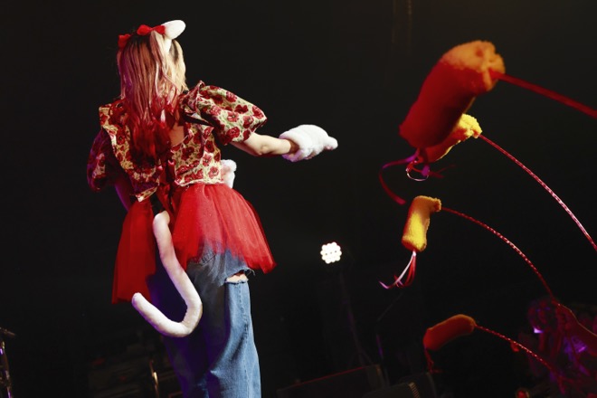 その後はコレサワと入れ替わりでメンバーが再び登場し、セッションを繰り広げる。軽快でコミカルなサウンドが奏でられる中、“らぶ便”と書かれた大きなダンボール箱がステージに運び込まれ、フロアでは巨大ねこじゃらしが配られた。すると、「にゃっ!」という声とともに、猫耳、猫の手のグローブ、しっぽを身に着けたコレサワが箱の中から出現。そのキュートな姿に歓声が上がる。猫愛に溢れた楽曲「にゃんにゃんにゃん」では観客がコレサワ手製のねこじゃらしを揺らすさまも印象的だった。ライブを続行するためコレサワが人間の姿に戻り、「あたしが死んでも」から後半に突入。「好きな人の好きなものは、私の嫌いなものでした」と、ぽつりと呟いて代表曲「たばこ」をエモーショナルに奏でる。