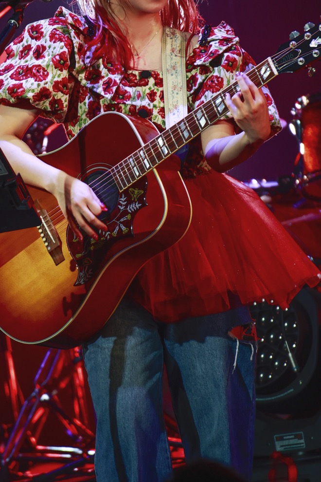 失恋ソングの「最後の彼女になりたかった」「さよなら恋人」を演奏するとメンバーがはけ、弾き語りコーナーへ。「君が帰った後には」をしっとりと爪弾く。今回のツアーについて「裏テーマでは、去年の8月でメジャーデビュー5周年を迎えたので、その感謝を伝えるツアーをやりたいなと思って。日本中なるべくたくさんの場所を回らせてもらいました。そういう節目とか記念のときに歌う曲を歌いたいと思います。これからもみんなの側で歌っていいですか?という曲です」と紹介したコレサワは、メジャーデビュー作『コレカラー』収録の「これから」を歌い上げる。アコースティックギターを力強く鳴らし真っ直ぐに歌を届ける彼女に、観客は熱い眼差しを向けていた。