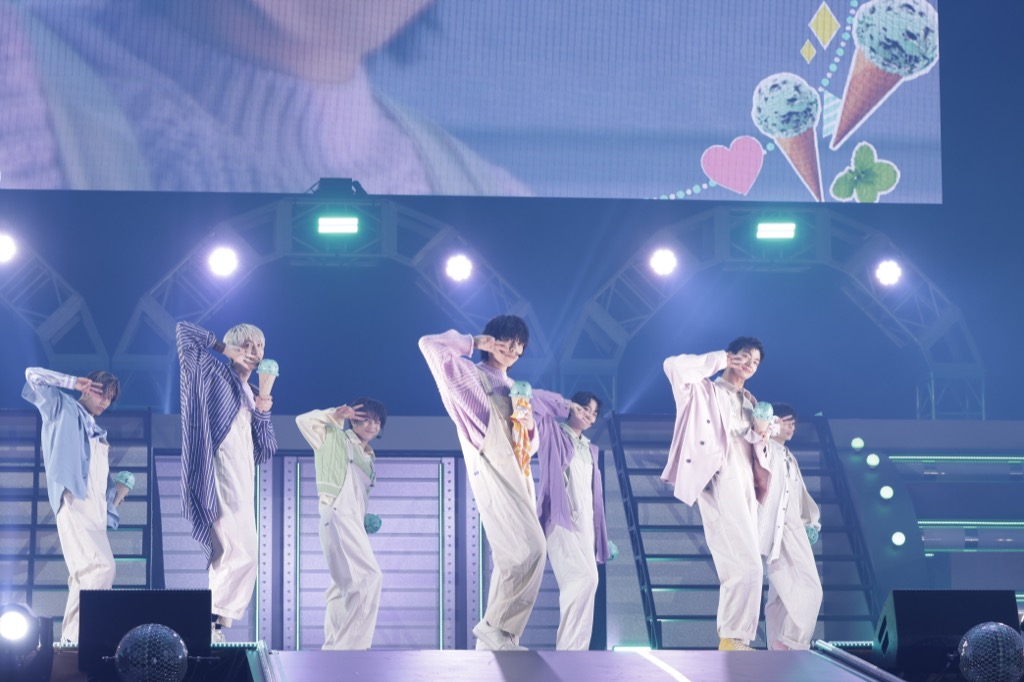 対照的に“Love & Sweet”を掲げた2日目の夜公演では、甘いラブソングでファンへの愛を訴える。まず“きっかけは自分にある。”で武藤潤役の古川毅(SUPER★DRAGON)が歌い始めたのは「チョコループ」。原因は自分にある。の楽曲の中でもSweetさを感じさせるで歌い継ぐ小泉光咲役の吉田仁人(M!LK)や、「代々木、行くよー!」と大倉空人になりきって初めて歌声を聞かせたアロハ(超特急)も、小道具のミントアイス片手に純粋無垢な少年の表情を浮かべる。リハから全力でやり切ったというだけあり、それぞれの母体グループでは絶対に見られない愛らしい仕草に場内は大興奮。オリジナルメンバーの吉澤要人に加え、長野凌大役に山本龍人(ICEx)、杢代和人役に森田璃空(Lienel)とフレッシュなメンバーも起用しつつ、桜木雅哉役のハル(超特急)も表情豊かに、全員が一種の新境地を垣間見せた。