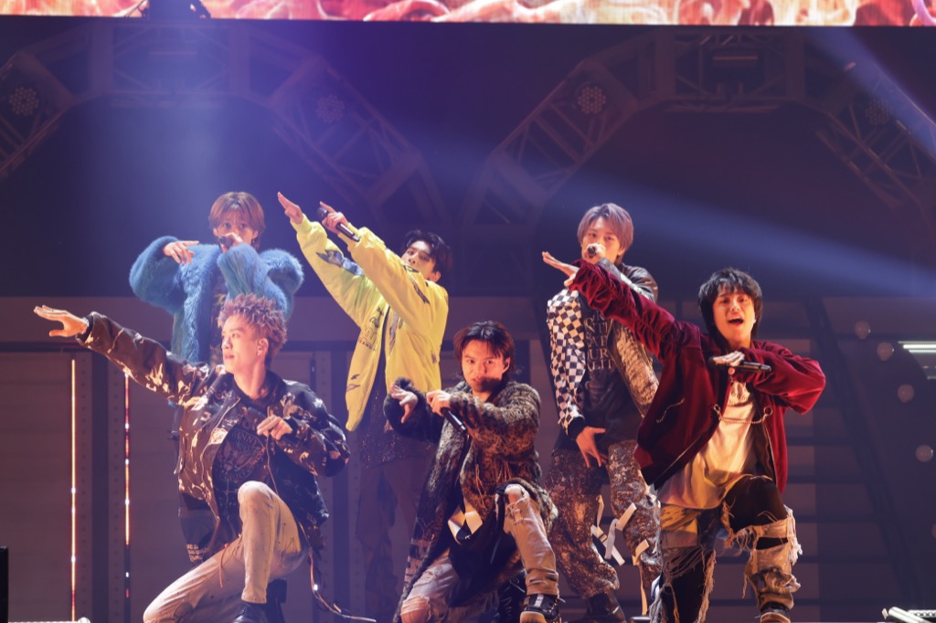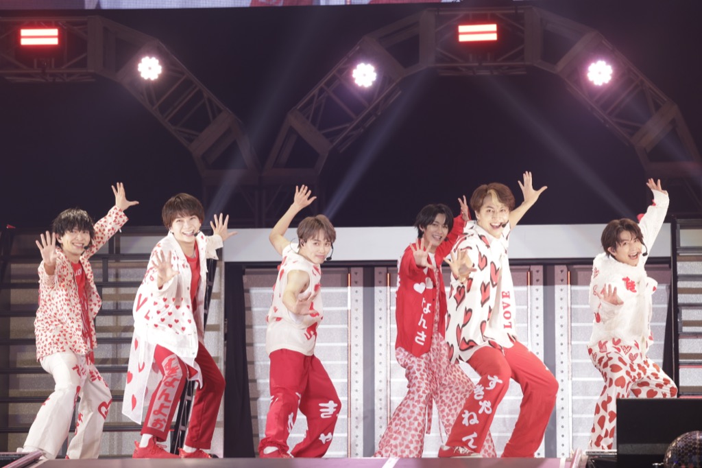 続いて法螺貝の音が鳴り、メンバーの土下座から始まったのは、第2位を獲得した西日暮里駅の西日本出身者ユニット。超特急のタカシ(大阪)、マサヒロ(山口)、ハル(熊本)、M!LKの吉田仁人(鹿児島)、塩﨑太智(和歌山)、曽野舜太(三重)の6人が、めでたいハート柄の紅白衣装で「青春~珍道中~」を歌う。“西日本!”と繰り返す曲頭から“ハイ!”というファンの掛け声が飛んで、笑顔いっぱいでハートを飛ばしまくる面々がモニターで抜かれるたび、場内には黄色い悲鳴が。ランキング発表時の「標準語の曲、いらんねん!」というタカシのリクエストに応えてか、“好きやで、好きっちゃ、好きやねん”と方言が随所に散りばめられ、それぞれが地元言葉で“好き”を告白する高速和風ダンスチューンは中毒性抜群。吉田の口上でおなじみの“チェスト!”の掛け声から、徳島生まれのユーキも「好きになってしもうたけん、つきおうてくれへん?」と舞台裏からモニター越しに特別出演して、場内を沸かせまくった。クライマックスではタカシが曽野、塩﨑、吉田を公演替わりでハグ。指アートや投げキスと、回を増すごとにアピールの度合いもレベルアップしていったので、今後もぜひパフォーマンスの機会があることを願いたい。
