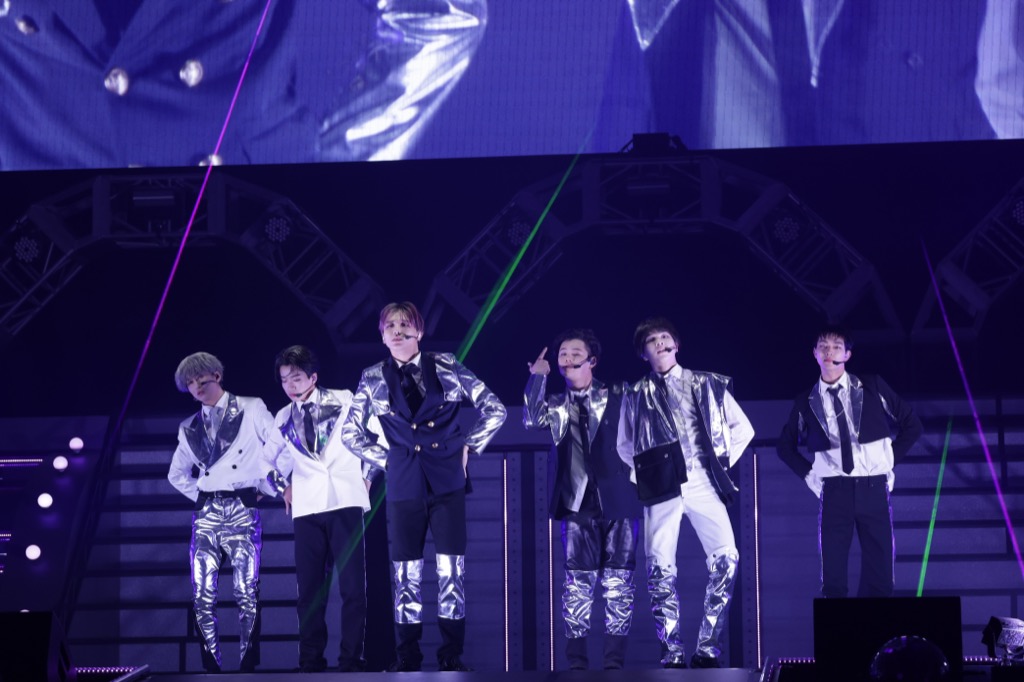 さらに、カラースーツの超特急が2階から現れて「Burn!」を放つと、「まだまだ行くよ!」というカイの声で、原因は自分にある。、BUDDiiS、ICEx、Lienelも加わり、全グループで全力のバッテンダンスを展開。大サビでは、センターステージに進んだタカシ&シューヤのツインボーカルに会場全員で光を捧げて、信じられないほど美しい光景を創り上げれば、想いがあふれるままにユーキはステージど真ん中でバク転。タカシのフェイクも凄まじく、EBiDANのグループとファンが一つになって声と空間を共有できる喜びを分かち合った。そして古川毅(SUPER★DRAGON)がオーディエンスのみならずメンバーをも煽り、今回のライブ演出を担当したユーキへバトンタッチ。初日には「急遽欠席になってしまった山中柔太朗(M!LK)、伊藤壮吾(SUPER★DRAGON)の想いも背負って」と、2日目には現在療養中のKEVIN(BUDDiiS)に触れて「来年はKEVINと一緒にEBiDANの曲とか作れたらいいなって」と語った。最終公演では、昨年の“エビライ”でEBiDANを卒業したDISH//の橘柊生が初日に観に来てくれたと明かし、「こうしてEBiDAN一丸となってエンターテイメントを一緒に作れるって本当に幸せなことだし、ここにいる一人ひとりの力がなかったら実現しなかったものなので、ホントにみんなに感謝してます。これから先、この最高のメンバーと一緒に、もっともっとデカいステージ、デカい夢、追いかけていきましょう」と、全体曲「New day! New wave!」を贈る。タカシとシューヤに始まり、各グループのボーカリストが壮大なナンバーを順に歌い継いでいく様は、まるで拡大し続けるEBiDANのスケールと絆の証のよう。金銀吹雪が舞い上がるクライマックスではレーザー光線が天井に光を灯し、“決してあきらめずに未来へ進もう”というメッセージを、歓喜の情景と共に力強く描き出してくれた。