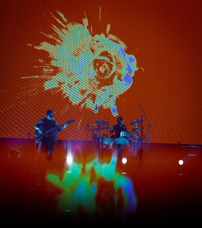 熱狂のライブを締め括ったのは「tokyo insomnia.」。ここでは、TakuyaとFuji(Ba.)がともにフロアすれすれまで腰を落として演奏を見せた後、最後にはフロアの柵に足をかけるくらいの至近距離に接近。楽曲終盤に差し掛かると、ステージ後方には前述のScorpy Jr.から、SCORPIONが大量製造される様子、磔のような状態の人間らしきなにかが灼熱で燃え焼かれる状態まで、この日に流れたすべての映像が走馬灯のように巻き戻して再生され、我々のシナプスに直接訴えかけてくる。