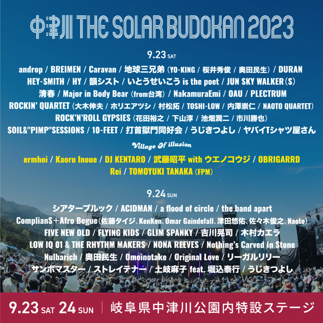 佐藤タイジ (シアターブルック)がオーガナイザーを務めるロックフェス<THE SOLAR BUDOKAN>が、2023年9月23日および24日の2日間にわたって、岐阜県・中津川公園内特設ステージで開催される。同公演にて、キャンパーのためのお楽しみ「Village Of illusion」が4年ぶりに復活することが発表された。
