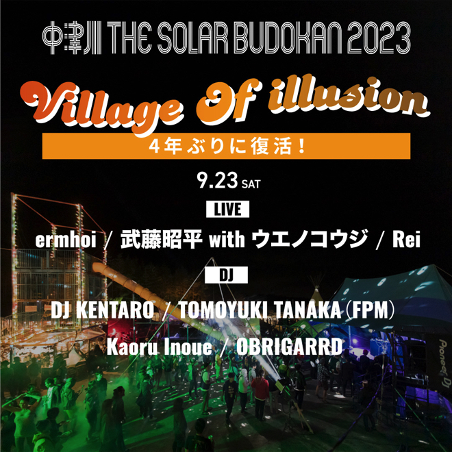 「Village Of illusion」は2013年に<中津川 THE SOLAR BUDOKAN>がスタートした当初から、キャンパーのため、また、夜まだまだ遊びたりない大人たちのためのステージとして、“一夜だけ出現する幻の村”というコンセプトで展開されてきた。今回は、ライブアクトとして武藤昭平 with ウエノコウジ、Rei、ermhoi、DJとしてTOMOYUKI TANAKA(FPM)、DJ KENTARO、Kaoru Inoue、OBRIGARRDが出演。アーティストやスタッフ、デコレーションチーム、様々なお店が4年ぶりに集まり、9月23日夜から深夜まで大自然の中の幻想的な空間でパーティが繰り広げられる。