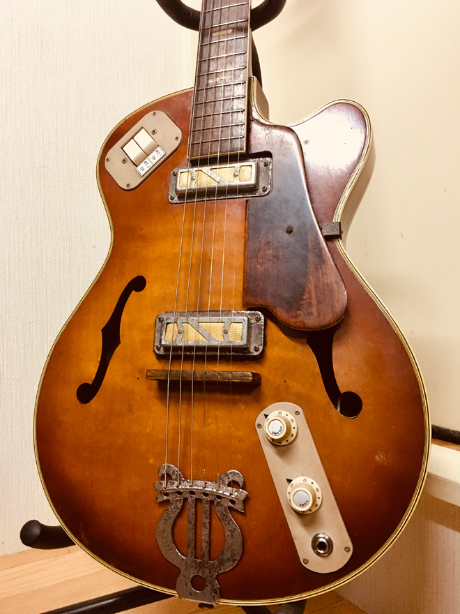 1962年テスコEP8 フルアコ。尊敬してるブルースマンが使ってて、どうしても欲しくなりオークションで手に入れました。買った時の状態はナット浮き、ペグ破損と多々酷い状態でした。