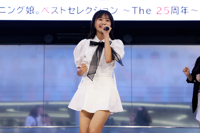 結成25周年イヤーのモーニング娘。’23が、東京・池袋サンシャインシティ 噴水広場で<モーニング娘。’23 NEWアルバム『モーニング娘。ベストセレクション ~The 25周年~』発売記念 ミニライブ&お見送り会>を開催。2023年5月に新加入した“17期メンバー”の井上春華と弓桁朱琴が、アルバム収録の新曲「なんざんしょ そうざんしょ」でフレッシュな初パフォーマンスを見せた。