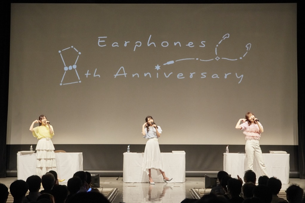 <Earphones 8th Anniversary Special Party>は、イヤホンズ8周年を記念したトークイベントで、久しぶりのリアルイベントということでチケットは一般発売直後から完売。3人からの「Earphones 8th Anniversary Special Partyへようこそ!」という掛け声でイベントはスタートした。