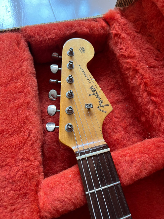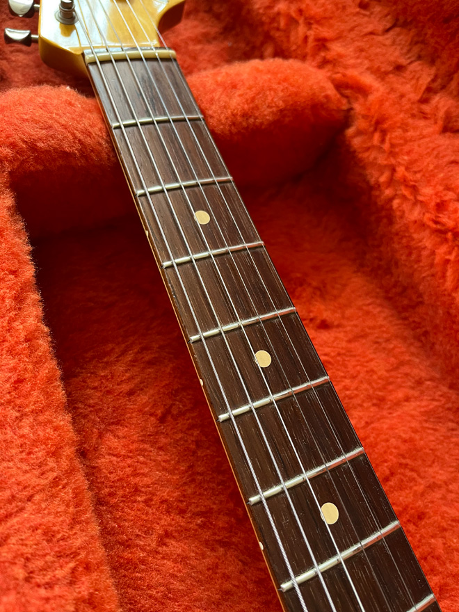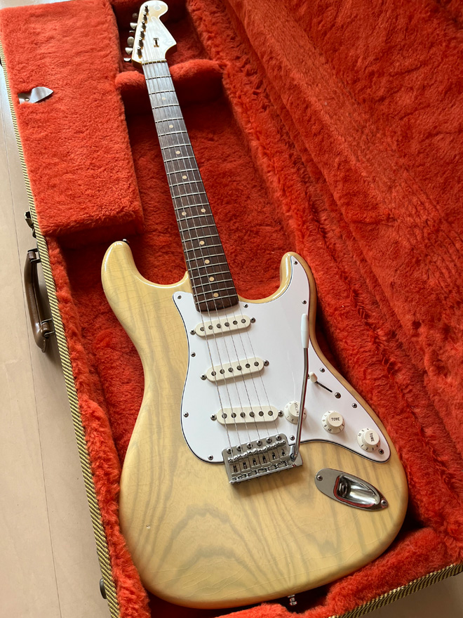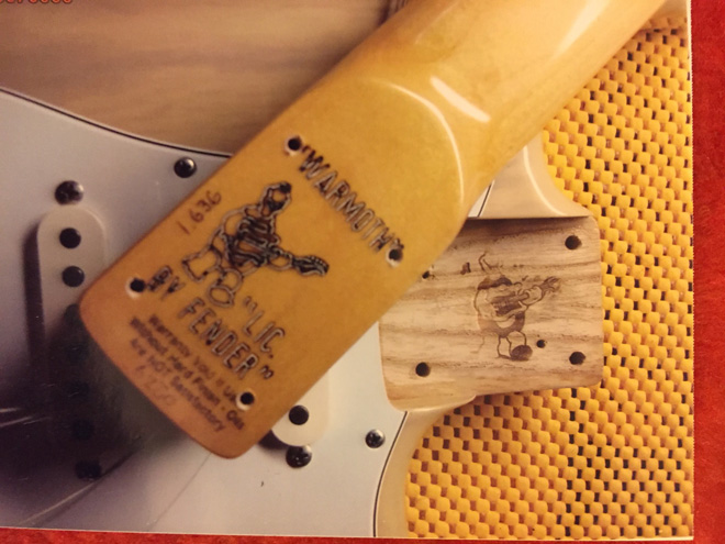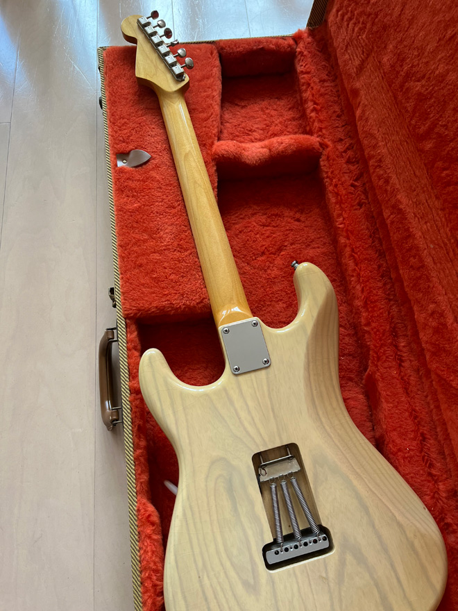 いかにも音が良さそうなルックス…というか雰囲気を漂わせていますね。アッシュの木目も100点、さすがワーモスって感じ。ワーモス製のストラトネック、いいですねぇ。フェンダーの公式ライセンスを取得しているワーモスならではの、由緒正しきストラト用リプレイスメント・ネックを組み込んだということなのかな。フェンダーも2020年からリプレイスメント・ネックの一般販売を開始してくれたけど、それ以前はネック単体の入手は困難でしたから、ニコイチとかシルエイティのような力技で対応していたものです。フェンダー用として作られたネックですけど、素性はワーモス。こういうややこしいところに萌えを感じる我々はやはり変態なのでしょうか。(JMN統括編集長 烏丸)