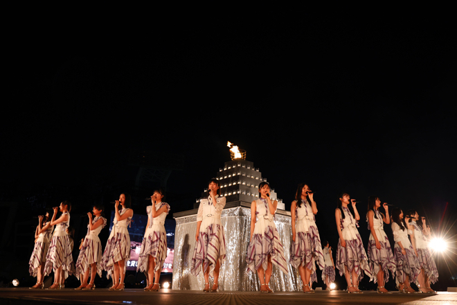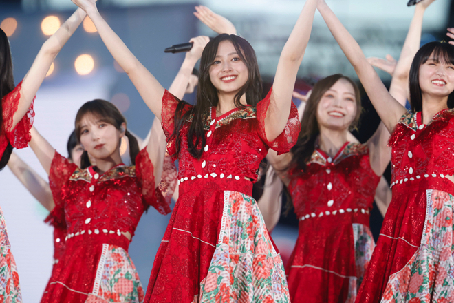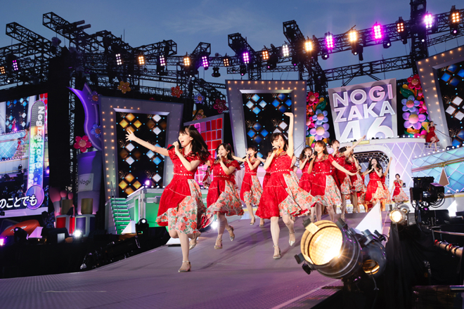 ライブ中盤では久保史緒里や向井葉月、金川、黒見明香、柴田柚菜を中心にプロ野球12球団のユニフォームを着用したメンバーたちが「Never say never」を堂々と歌唱。また、続くバラードアレンジが施された「シンクロニシティ」では久保や賀喜などがソロを取りながら、メンバー全員でアカペラを交えて繊細な歌声を響かせていく。そして、井上からの提案で会場中のペンライトが一斉に消されたあと、「皆さんにとって大切な人のことを思い浮かべながら聴いてください」のメッセージとともに、最新シングル収録曲「誰かの肩」が感情をたっぷり込めて歌い紡がれていった。センターステージに灯された炎の明かりだけで歌唱するこの感動的かつ幻想的な演出は、野外ライブならではの醍醐味と言えるだろう。