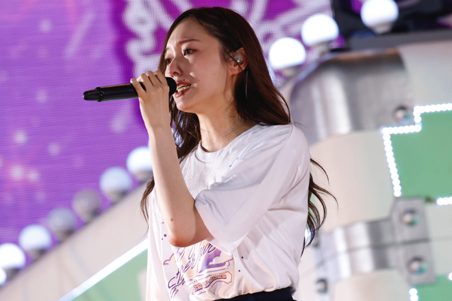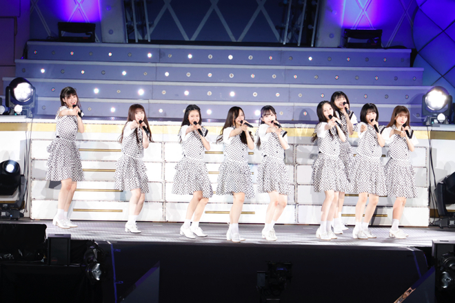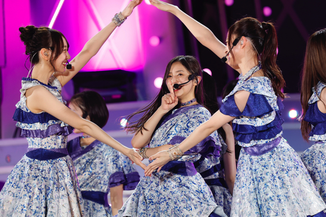続くブロックでは、期を超えた組み合わせによるユニット曲を用意。日替わりで異なるメンバー、選曲で披露されたユニットパート、この日は「意外BREAK」「Am I Loving?」「自惚れビーチ」の3曲が選ばれ、オリジナルメンバーのそれとは異なる個性が光る、フレッシュなパフォーマンスが展開された。その後、「空扉」からは再びトロッコやフロートを使い、メンバーが会場中を移動しながらオーディエンスのもとへと出向いていく。また、「君に叱られた」「僕は僕を好きになる」「夜明けまで強がらなくてもいい」といったヒットシングルが立て続けに披露され、観客のボルテージが上がったところで33rdシングルのアンダーメンバーがステージに登場。松尾美佑をセンターに据えた「踏んでしまった」では、楽曲の持つ疾走感と相まってメンバーのパフォーマンスも力強さを増していく。さらに、「錆びたコンパス」では会場中が黄色いペンライトで染め上げられ、会場の一体感が高まっていった。