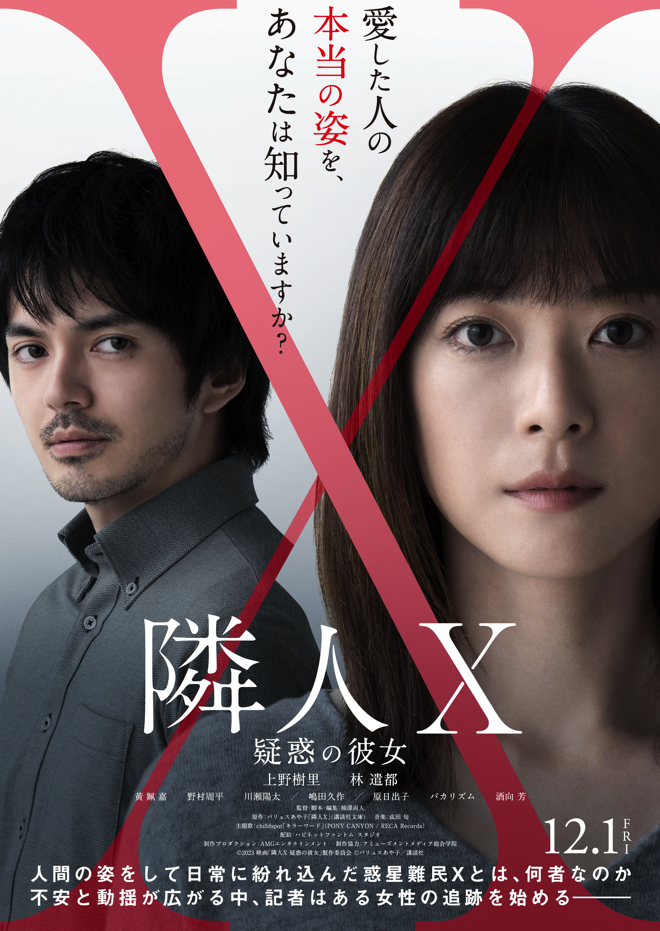 『隣人X -疑惑の彼女-』は、パリュスあや子の小説『隣人X』を原作として、紛争のため故郷を追われた「人間の姿をした“惑星難民X”」が溢れる世界を舞台に展開されるミステリーロマンス。X疑惑をかけられる主人公の柏木良子役を上野樹里、良子を追う週刊誌記者の笹憲太郎役を林遣都が演じる。