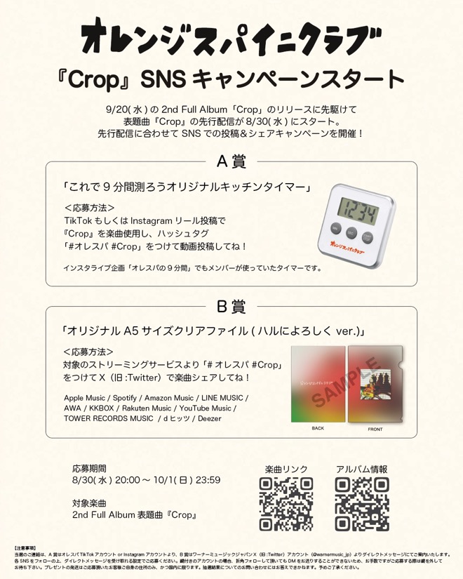 今回「Crop」の先行配信に合わせてTwitter、Instagram、TikTokでのSNSキャンペーンもスタートした。楽曲を使用したオリジナル動画や、「Crop」の感想を「#オレスパ #Crop」をつけて投稿すると、豪華賞品が抽選で当たるキャンペーンとなっている。