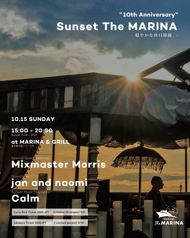 10周年の締めくくりは<Sunset The MARINA>と深い縁のあるゲストアーティストが登場することとなった。世界のチルアウト・シーンにおける最重要人物であり、本イベントにとってもう1人のレジデントセレクターと言えるミックスマスター・モリス。また、美しく儚い歌声を多種多様な音楽影響と共にオルタナティブな独自の世界で表現し続けているjan and naomiが夢の島で久しぶりのライブセットを披露。そして、すべてを包み込むのはミュージックナビゲーターCalmだ。