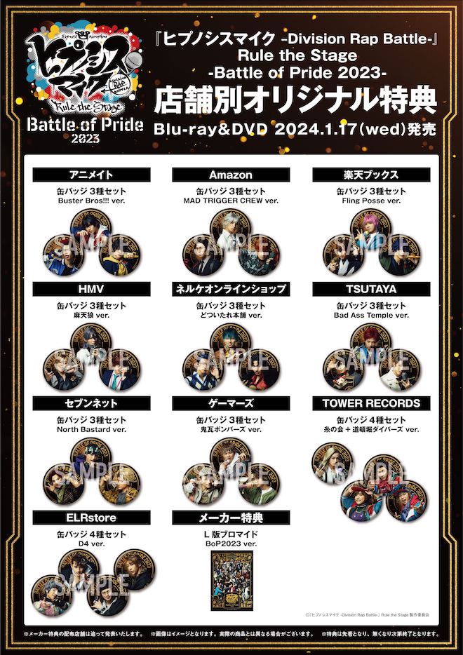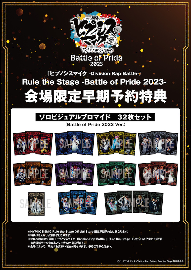 HYPNOSISMIC Rule the Stage Official Storeでは、限定で早期予約特典「ステージショットブロマイド 32枚セット -Battle of Pride 2023- Ver.」を手に入れることができ、『ヒプノシスマイク-Division Rap Battle-』Rule the Stage -Battle of Pride 2023-公演会場で予約するとその場で「ソロビジュアルブロマイド 32枚セット -Battle of Pride 2023-会場予約限定 Ver.」がプレゼントされる。