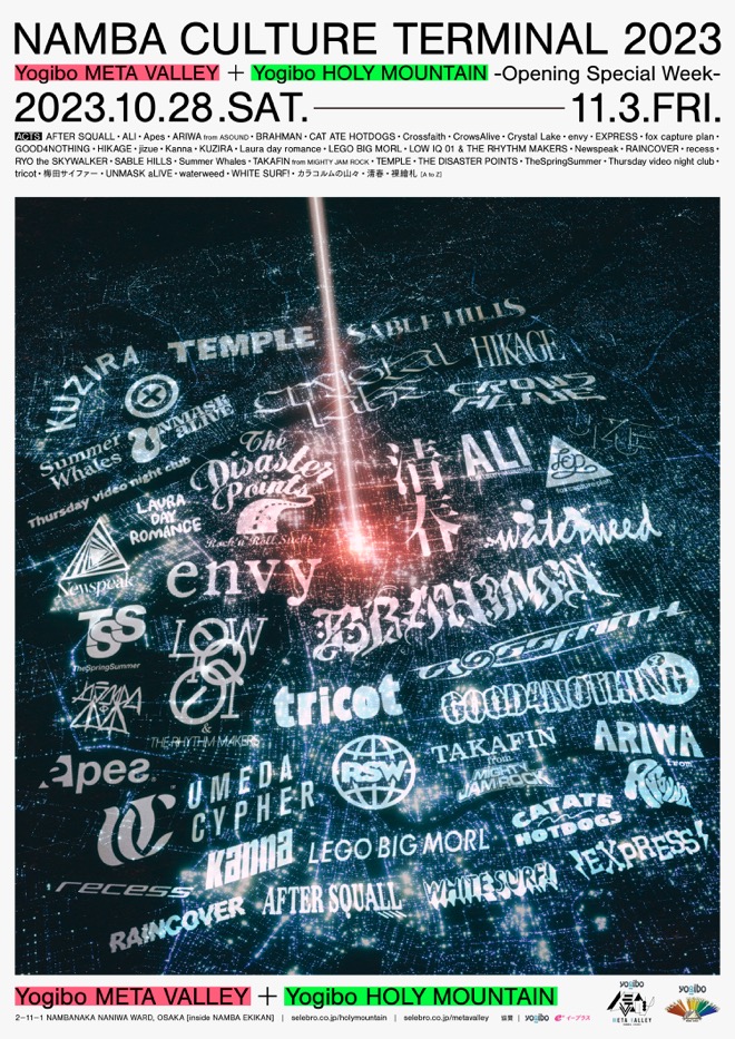 大阪のなんばに、2つのライブハウス“Yogibo META VALLEY / Yogibo HOLY MOUNTAIN”が10月28日にオープンすることは既報のとおり。そのこけら落とし公演としてオープン日より1週間にわたり開催される<Namba Culture Terminal 2023 -Opening Special Week->の出演者が最終発表となった。