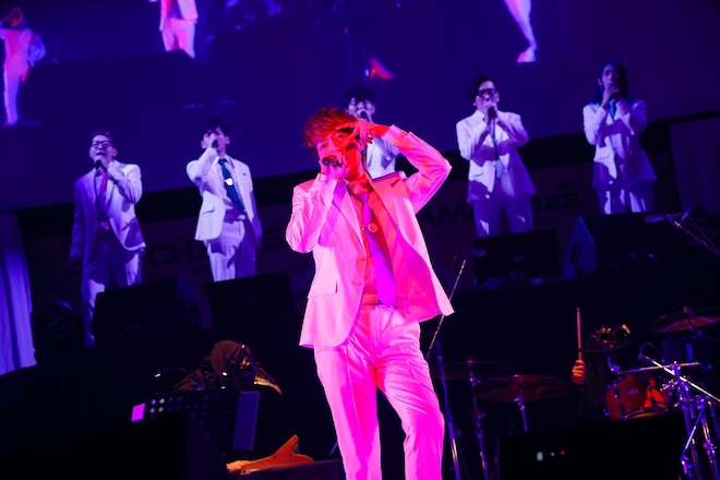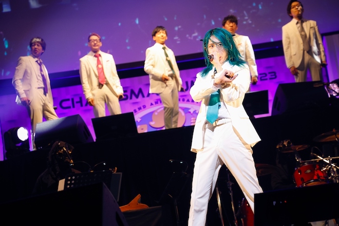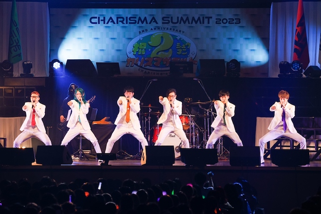 そして、ラストの議案は「それぞれの立場により“正邪”の基準が分かれる今、改めて正と邪の在り方を議論せよ」。小野の進行で「犬と猫なら犬のほうが可愛いのは正しい」「節約と浪費なら節約のほうが正しい」といったテーマで正邪を議論した。そして、3つ目のテーマとなった「ふみやだけソロ曲を歌わないのは正しい」では、小野以外の5人が悪魔となり、逃げようとする小野をステージ中央に引っ張り出すと、無事「When The Charisma Go Marching In」(※ワンコーラスのみ)が披露されることに。さらに「Carisma Battle Anthem」は、6人のカリスマ声優(※大河は声のみ)を従えて、重厚に、熱くパフォーマンス。続けて「神の領域(リージョン)」も全員で歌唱し、カリスマのカリスマたる所以を観客に教え込んだ。歌い終えたあとも、余韻がなかなか消えない一同。何度も天に拳を掲げ、歓声を全身で浴びていた。