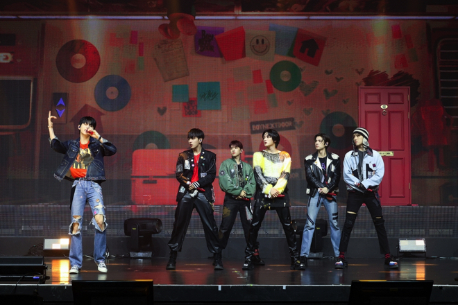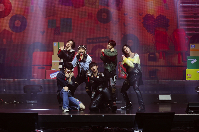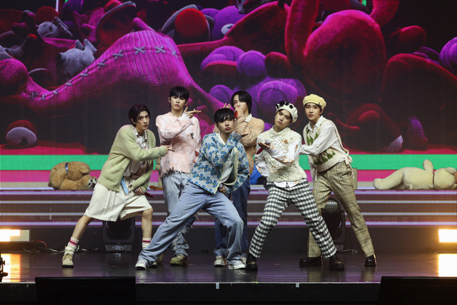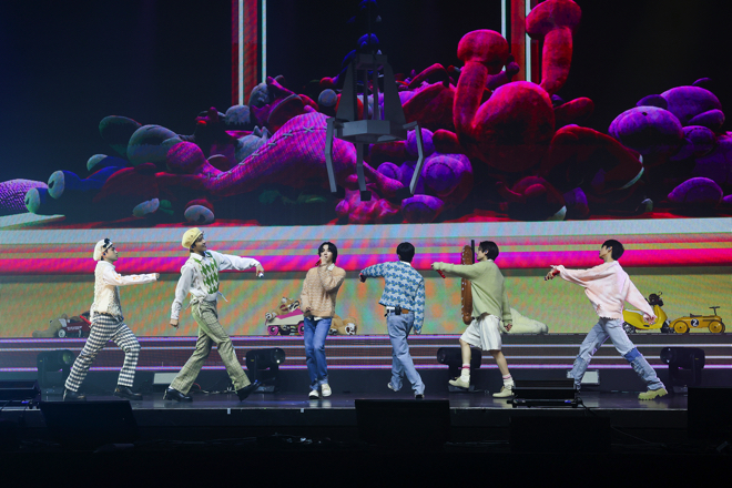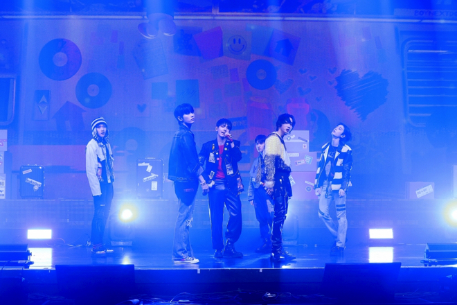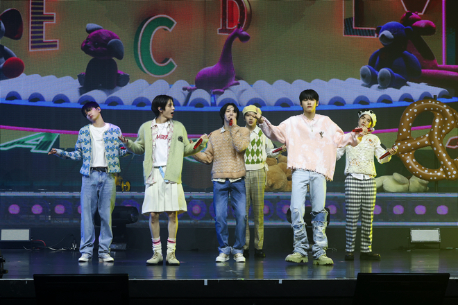 そして「But Sometimes」のMV初公開に続き、『WHY..』の収録ナンバー「ABCDLOVE」のイントロが鳴り響くと、立ち位置についた6人は再び真剣な表情に。チルなメロディラインを持つレゲエ風のこの曲はデビュー作のカラーをほんのり滲ませながらも、より成長したメンバーの姿が確認できる。愛する人が去った寂しさを残しながら、やがて前向きな未来を目指すようになる歌の主人公は、さまざまな課題をクリアして成果を手に入れてきたBOYNEXTDOORと重なるところが多いように思う。