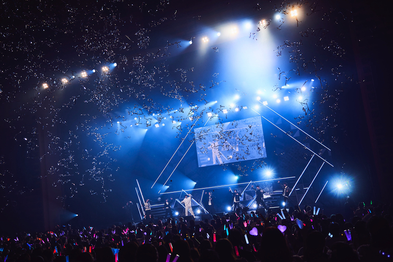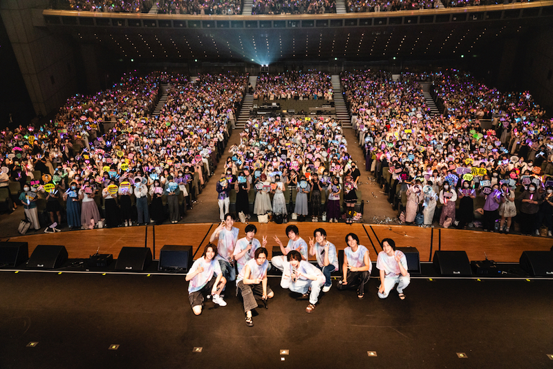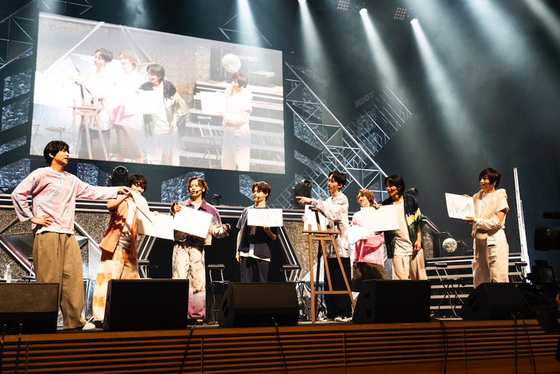 8人のソロが終わると、次は再びユニットソング。ASTRA RINGの「君の知らないブルー」が始まると、紘希と弥月が客席へ降りて歌い始めたのだ。サプライズ演出に会場は大いにざわめく。続いて凪沙と翔琉が客席2階から登場し、「Memories with you」を歌う。まさかの登場に驚きつつも、客席は用意してきたうちわやペンライトを振り、それぞれの気持ちを彼らにぶつける。2人がステージに戻ってくる間を繋いだ悠輔、征行、黎士郎は、そのまま続けて「またね」を歌いながら客席へ。フレンドリーで温かい雰囲気が会場を包み込む。