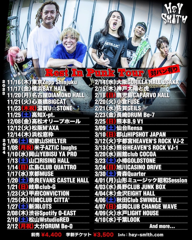 また、11月16日のZepp Shinjukuを皮切りに全国45箇所を回るツアー<Rest In Punk Tour>のチケットオフィシャル3次先行もスタートしている。今週末にはHEY-SMITH主催の野外フェス<OSAKA HAZIKETEMAZARE FESTIVAL 2023>も控えている。