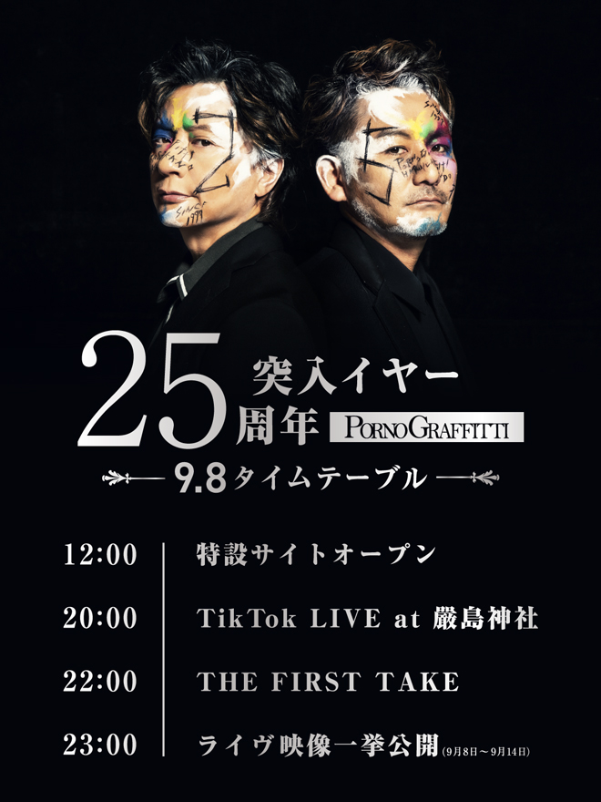 20時からは、ポルノグラフィティ×広島県コラボプロジェクト第二弾として、<25周年イヤー突入記念TikTok LIVE at 嚴島神社>を無料配信する。5月31日に配信リリースされた広島サミット応援ソング「アビが鳴く」をはじめ、デビュー日を飾るに相応しい楽曲をこの日しか見ることのできないアコースティックアレンジで披露する。メンバーの地元広島、そして世界文化遺産である嚴島神社でのライヴということで、嚴島の神や、デビューしてから今に至るまで、応援・支え続けてくれた全ての人への感謝の気持ちを込めたライヴは必見である。