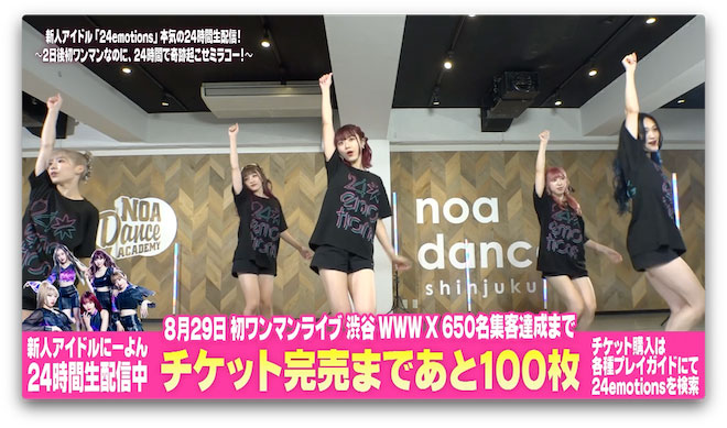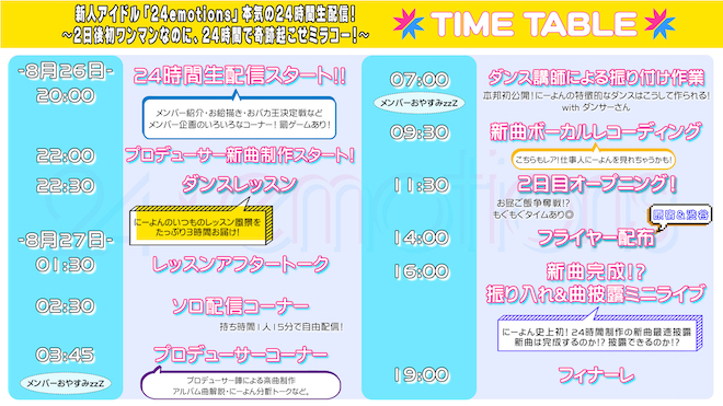 24時間配信では私たちが、普段はお見せする事のない一面をさらけ出す企画や、いつも行っているトレーニングやレッスンの風景をお届けしたり、なんと8月29日のワンマンライブで披露する1曲をこの配信時間内に、プロデューサーさんたちが曲を作り、コレオグラファーさんが振りを考え、私たちがレコーディング、振り入れをして披露するという超無謀なミッションまで!