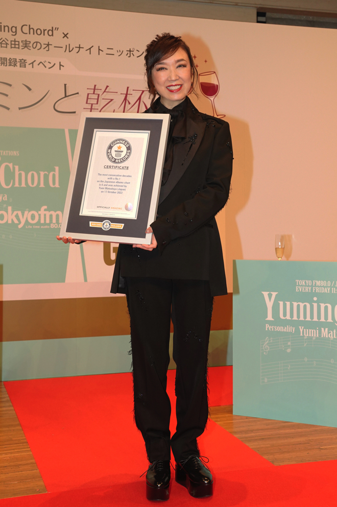『ユーミン万歳!〜松任谷由実50周年記念ベストアルバム〜』は、日本全国のラジオリスナーから寄せられた楽曲のリクエストとその曲にまつわるエピソードをもとに選曲されたベスト盤だ。この作品による世界記録達成を祝い、会場に集まったリスナーたちと乾杯を交わした。