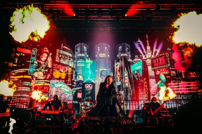 6月に配信リリースされた比較的新しい楽曲でありながらもツアーを経て今やライヴのニューアンセムとしての風格を感じさせた「TAKING THEM DOWN」、早くもHYDEがスタンディングエリアに分け入り、殺到するオーディエンスの手に支えられながら激情を迸らせた「SICK」と1曲たりと目を離す隙もないが、前半戦、特に息を呑んだのは「WHO’S GONNA SAVE US」で見せたHYDEの鬼気迫るパフォーマンスだった。雨が降りしきり時折稲光も差すNEO TOKYOをバックにしてステージの床をのたうち身を絞るようにして歌うその姿に、ライヴ冒頭に映し出されたこれまでのライヴ映像が心に蘇って重なる。未曾有の危機に直面し身動きも取れなくなってしまったあの期間、誰も助けてくれないのなら俺がやるとばかり、手探りで戦い続けた彼の覚悟がどれだけの人を救ったことだろうか。松明の炎が揺れるなか、ピアノソロを挟んで披露された「THE ABYSS」での、深い低音ヴォイスから一気にファルセットへと上りつめるサビの歌唱、運命に翻弄された者の絶望と一縷の希望を見事に体現したそのドラマティックなヴォーカリゼーションにはただただ目をみはるしかなかった。