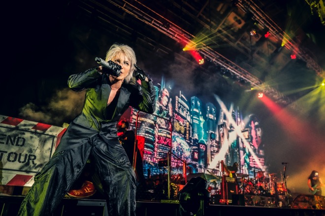 これまでのライヴハウスから一気に規模が拡大、HYDEのライヴがアグレッシヴモードへと舵を切ってから初のアリーナ公演となることもあってだろう、開演前の会場に満ちる熱気はいつにも増して濃厚で、オーディエンスのさざめきもいっそうの期待をはらんで華やか。ステージ上のスクリーンには現在時刻を示すデジタル数字が映し出され、秒単位で時を知らせている。17時ジャスト(表示では“16:60”)に場内は暗くなり、スクリーンには現在時刻と一緒に次々と浮かんでは消える“ANTI FINAL”から最新のライヴ映像が客席の興奮の火に油を注ぎ、そうして17時06分、“16:66”と“6”が3つ並ぶや雑踏の中から進んでいくVTRが流れ、いよいよステージの背景いっぱいにNEO TOKYO(HYDEが思い描く架空の近未来都市)が広がった。HYDEライヴのアイコン的演出でありながら、今ツアーでは登場することのなかったNEO TOKYOの思いがけぬ出現とさらに進化した佇まいに歓声を上げるオーディエンス。“ANTI FINAL”以来、久々に幕張という地でNEO TOKYOに再会できた喜び、その粋な計らい自体がスペシャルな演出なのだとも思えてくる。NEO TOKYOの代わりに今ツアーにおいてゴシックな存在感を放ってきた巨大な蛇十字のオブジェも天井高くに吊り下げられて客席を見下ろし、また、ステージには廃車のパトカーや侵入禁止のフェンスなどが設えられて荒廃した路地裏の様相を呈しており、微に入り細を穿って構築された世界観は観る者をたちまちその深奥へと誘うのだ。