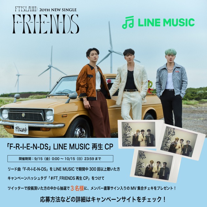 また9月15日から、20thシングル「F-R-I-E-N-DS」の先行配信を記念して、LINE MUSICでの再生キャンペーンを実施することも発表した。こちらは抽選で3名様にFTISLANDのメンバー直筆サイン入りの集合チェキが当たるといった豪華なキャンペーンになっている。
