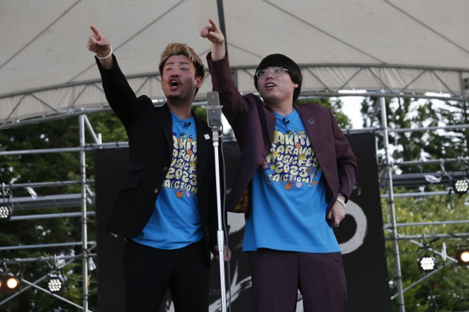 ゴールデンボンバーは1曲目「#CDが売れないこんな世の中じゃ」からいきなりタオルの華が咲き乱れる。MCで喜屋武は謎のきりたんぽ愛を告白し、樽美酒が田沢湖のたつ湖像をもっと大事にせよと声をあげたのは完全に前フリ。「抱きしめてシュヴァルツ」の間奏で、喜屋武が仕込んだ大量のきりたんぽを頬張り、樽美酒は自らの肉体美を曝け出してたつこ像になりきった。ケルト音楽を取り入れた「Yeah!めっちゃストレス」、ユーロビートの「令和」などパフォーマンスだけでなく音楽的にもなんでもありのステージはただただ楽しい。ラストはもちろん「女々しくて」。スクールメイツ風ダンスで締めた。