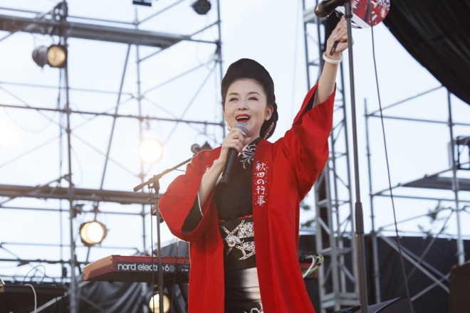 「今日じつは、あの曲を一緒に歌いたいということで、ある方をお呼びしていいでしょうか?」と高橋が呼び込んで登場したのは、藤あや子(仙北市出身)。いきなりの大物歌手の出演に会場がどよめく。着物に赤いハッピというスタイルで披露するのはもちろん「秋田の行事」。いきなり豪華なコラボが実現して、2日目のACMFがスタートした。藤あや子は自身の出番のあと、ACMFに寄せてこんなメッセージを残してくれた。