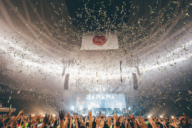 これまでのライブハウスから会場の規模はいっきに拡大。有歓声になって以降、初の大バコワンマンということもあって、開演前から観客の期待感が膨らむ。ライブの演奏をつとめるKREBandが「Na Na Na~2019Ver.~」のイントロを奏でるとKREVAが登場。観客の歌がないと成立しないという理由で封印してきたライブ終盤の定番曲の幕開けに、客席は絶叫。「Dr.K」の掛け声で客電つき、金テープが舞うなか、歌えなかった期間を取り戻すように、オーディエンス一丸となって“Na Na Na Na Na”を武道館に響き渡る声で大合唱。ライブはど頭からクライマックスの盛り上がり。早くもエンディング並みの感動的な光景が場内に広がっていく。