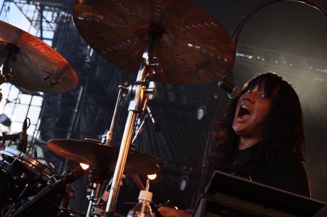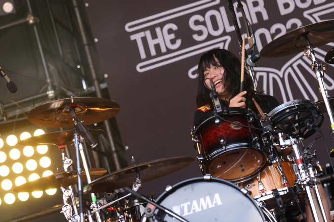 そして、しばたありぼぼの「(ステージへ)太陽光を送って欲しい」というリクエストのもと、客席のいちばん後方からパワーを送りながらウェーブのように順々にジャンプしていく“ソーラージャンプ”をRevolution STAGEに詰めかけた全員で決め、より気持ちも熱も高まった中、カオティックに乱れながらヤバTらしいセンスが冴え渡る「Blooming the Tank-top」、激しさマシマシで気合いの乗り方がヤバかった「ヤバみ」を連投。