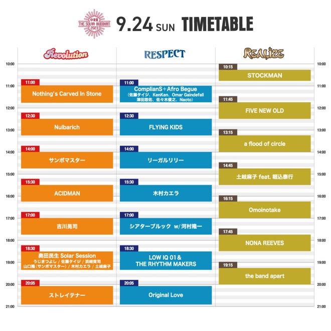 【9月23日(土)】androp / BREIMEN / Caravan / 地球三兄弟(YO-KING, 桜井秀俊, 奥田民生) / DURAN / HEY-SMITH / HY / 韻シスト / いとうせいこう is the poet / JUN SKY WALKER(S) / 清春 / Major in Body Bear (from 台湾) / NakamuraEmi / OAU / PLECTRUM / ROCKIN’ QUARTET(大木伸夫, ホリエアツシ, 村松拓, TOSHI-LOW, 内澤崇仁) / ROCK’N’ROLL GYPSIES(花田裕之, 下山淳, 池畑潤二, 市川勝也) / SOIL&“PIMP”SESSIONS / 10-FEET / 打首獄門同好会 / うじきつよし / ヤバイTシャツ屋さん / DUCK HOUSE