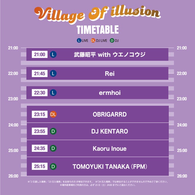 【Village Of illusion】ermhoi / Kaoru Inoue / DJ KENTARO / 武藤昭平 with ウエノコウジ / OBRIGARRD / Rei / TOMOYUKI TANAKA (FPM)