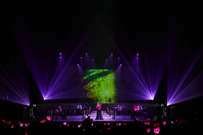 オープニングに選ばれたのは、「AMAZING GRACE」。2人のバレリーナとともに神聖な歌声を響かせ、観客をしっかりと惹きつけた。紗幕にバンドメンバー(河野伸/Key、佐野康夫/Dr、海老沼崇史/B、馬谷勇/G)、バレリーナ(HARUNA、MIHO)、ダンサー(万葉)、そしてコンサートスタッフの名前が映し出された後、幕が上がる。