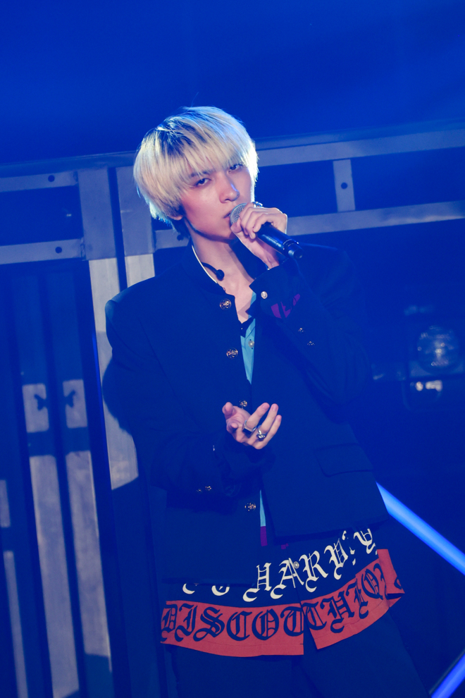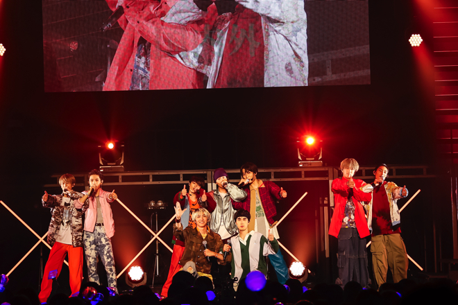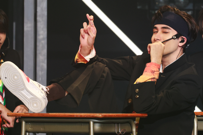 メンバー9人が龍崎高校のヤンキー学生として登場した1部では、学園祭のためのホームルームという名目で、この日だけのお楽しみ企画が多数展開された。詰襟の学ランを着崩して学校机の上に乗りあがり、ワイルドなラップが吹き荒れる「BADASS」で幕開けからアウトローなムードを全開にすると、まずは学園祭での披露曲を争い3チームに分かれてバトル。BLUEが選んだメンバーのイメージランキングを3組それぞれに予想するが、“プレゼントのセンスがありそうなメンバーは?”というお題で、「電車のものしかあげないから」と全組が鉄オタの伊藤壮吾を9位に指名したのに反し、最年長の志村玲於が最下位に入る結果に場は騒然となる。「嘘でしょ?」「おかしい!」とメンバーは動揺し、志村自身も「俺、壮吾より下……!?」と泣きそうになって、見かねた田中洸希が「もう、この企画やめよう!」とストップをかける一幕も。結果、続く大縄跳びでも勝利した飯島颯、伊藤壮吾、柴崎楽のチームが「NICHIYOUBI」を爽やかに贈り、他メンバーの乱入も受けて飯島は「気持ちよかったね!」と満足そうに微笑んだ。
