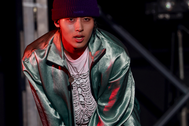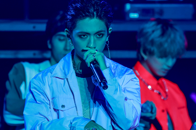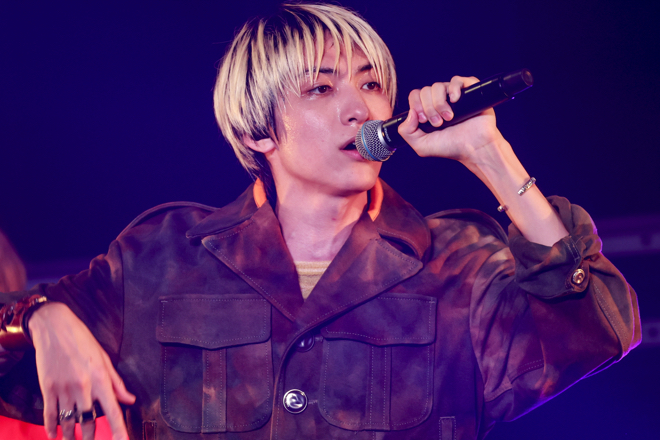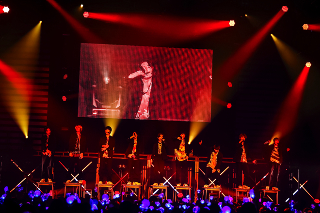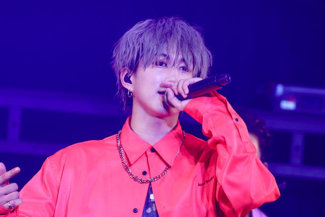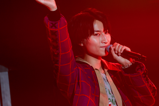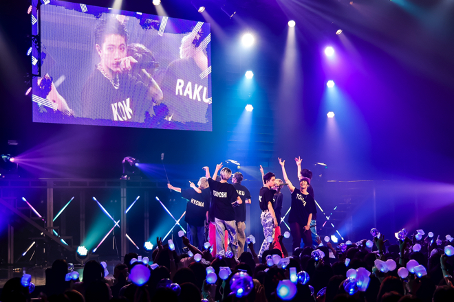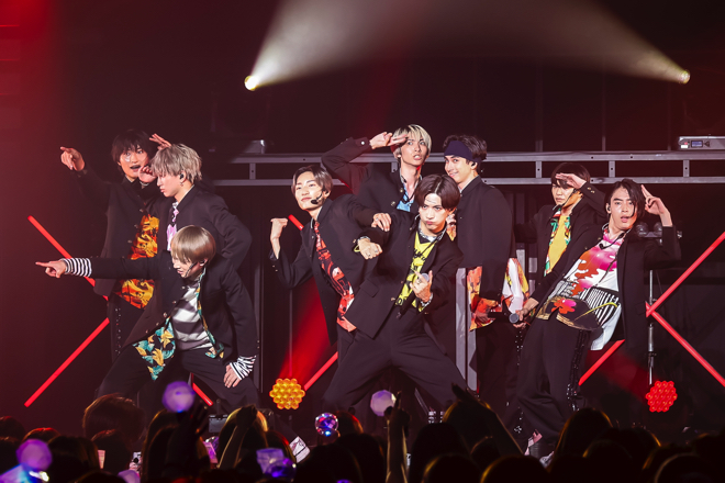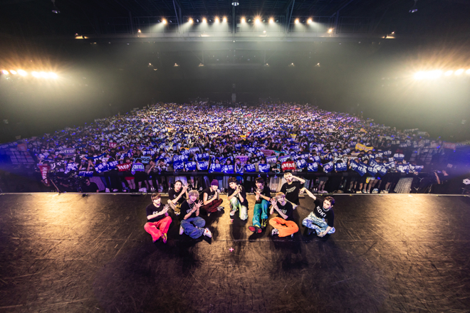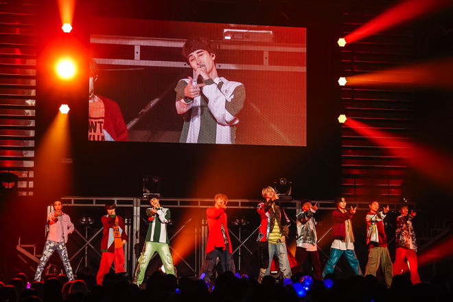 成熟しきった世界観が漂うなか、自身の覚悟を改めてクールに昇華した「X」に、新たなキラーチューンとして今年誕生したミクスチャーロック曲「Tap tap tap!」と畳みかければ、BLUEもグループカラーである青に光るライトスティックを振り上げて熱狂。楽曲のタイプは異なるものの、いずれも限りなくメンバー発信で作られたナンバーであり、彼らの豊かなクリエイティビティには驚嘆するばかりだ。一方、最新配信曲「Reach the sky」では一心にタオルを振り、生身のパワーで問答無用にオーディエンスの心を動かすリアリティも彼らの大きな魅力。この日は、そこに8年の歴史と物語が加わることで、さらなる感動を呼ぶことになり、アンコールではステージでひとりスポットを浴びた池田から、古川へと朗々たるアカペラをつないで始まった「KITTO→ZETTAI」に、フロアから悲鳴のような歓声があがる。サンダードラゴンの田中、池田、松村がボーカル&ラップに加わり始めた、いわば現在のSUPER★DRAGONの“原点”とも言えるナンバーに、今持てるスキルを注ぎ込む9人の姿からは、さらに上へのステージへと向かう彼らの熱い覚悟がにじんでいた。