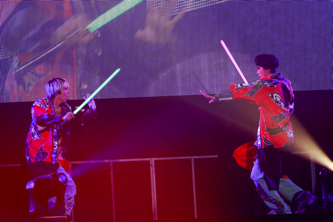 MCでは結成からの年月を振り返り、ジャンが「一番大きかったのが、年長組のファイヤードラゴンに、年少組のサンダードラゴンが生まれたこと」と語っての後半戦では、2016年に始まったグループ内ユニットが登場。まずはファイヤードラゴンの4人が残り、きらびやかなネオンとミラーボールの光が似合うオシャレな最新曲「Aim So High」で、ハードなパフォーマンスを繰り広げたかと思いきや、なんとサンダードラゴンの「GETSUYOUBI」を元気いっぱいにカバーしてBLUEを驚かせる。そこに合流したサンダードラゴンの5人は、逆にファイヤードラゴンのラブソング「ARIGATO」を歌唱するというサプライズで、おなじみの楽曲に新鮮な表情を描き加えていくことに。注目すべきは古川と池田のボーカル同士、ジャンと田中・松村のラッパー同士での歌割り交換のみならず、それぞれ普段は歌うことの少ない志村と飯島、伊藤と柴崎のダンサー陣もしっかりとソロを取っていたことで、そこにも新たな可能性を垣間見ることができた。さらにサンダードラゴンの5人は、ダンス、ボーカル、ラップが緻密に絡み合う自身の最新曲「Bad Bitter Honey」で、スキルとタフネスが求められるパフォーマンスを見事に体現。初期曲と最新曲を並べて確かな進化を記すのみならず、曲交換で秘めたるポテンシャルを感じさせてくれたのが嬉しい。