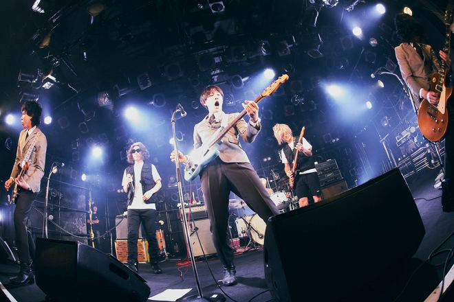 ステージからハケるサンチョーズを見送りながら、これからどんなライブになるのか説明したROY(Vo, Ba)が「みなさん、準備はよろしいですか? 飛びあがれますか!? 声も出せますか!?」と声を上げ、バンドの演奏は、とびきりポップなTHE BAWDIESのロックンロール「SKIPPIN’ STONES」になだれこむ。ミラーボールが七色の光を放つ中、TAXMAN(Gt, Vo)がワウを踏んだファンキーなカッティングを閃かせ、JIM(Gt, Cho)がフリーキーなスライド・ソロをキメると、演奏がテンポアップ。そして、「飛び上がれますか!? 行くぞ!」というROYのシャウトを合図に観客がジャンプ!