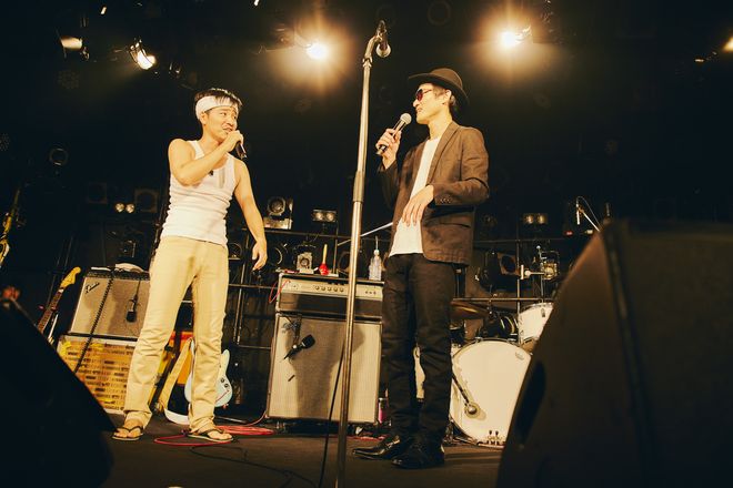 「飛んでもらったんで、次は歌ってもらってもいいですか? 初めての人も安心してください。俺らの曲は1番聴いたら、2番3番歌える仕組みになってます」とROYが観客に語りかけてから演奏した「LET’S GO BACK」はMARCY(Dr, Cho)のドラムが跳ねるブリティッシュ・ビート・ナンバー。ROYの「1-2-3-Go!」を合図に観客がサビをシンガロング。フロアがさらに盛り上がったところで、「最初のゲストを呼びたいと思います」とROYが呼び込み、ステージに出てきたのが、福徳演じるリーゼントに革ジャンのギタリスト。代表曲の「もう何も言わないで」をTHE BAWDIESの演奏で歌うのかと思いきや、結局、音色がキラキラとしたインスト・ナンバーだったというオチのコントだったのだが、「ベテランから新人まで、新旧織りまぜたたくさんのゲストが出てきます。俺らも新旧織りまぜていろいろな曲をやりたいと思います」とROYが言ったとおり、そこからさまざまなゲストに扮したジャルジャルがTHE BAWDIESと入れ代わりに登場して、コントを繰り広げていく。