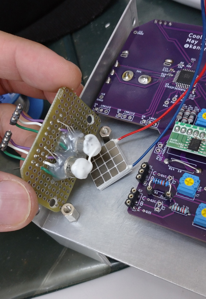 温度をコントロールするための温度センサとしてサーミスタも装着