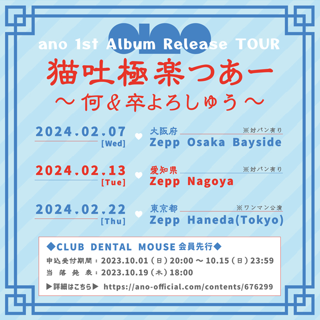 また、アルバムの封入特典として2024年2月に開催される<ano 1st Album Release TOUR 「猫吐極楽つあー 〜何&卒よろしゅう〜」>のライブチケット先行抽選シリアルナンバー入りチラシの封入が決定。