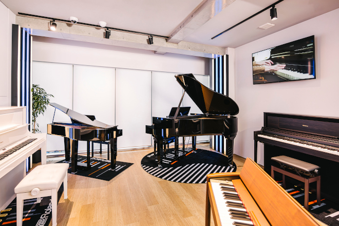 2階は、本格的なデジタル・グランドピアノからエントリー・モデルの電子ピアノまで、さまざまなピアノ製品を展示販売。ピアノを試奏も可能だ。