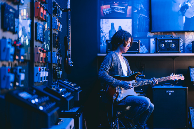 地下1階は、ローランドの電子ドラム「Vドラム」シリーズとBOSSブランド製品のフロア。ギター関連製品は、コンパクト・エフェクター、マルチ・エフェクター、ギターアンプなどを多数展示。その場でゆっくりと試奏でき、購入することもできる。