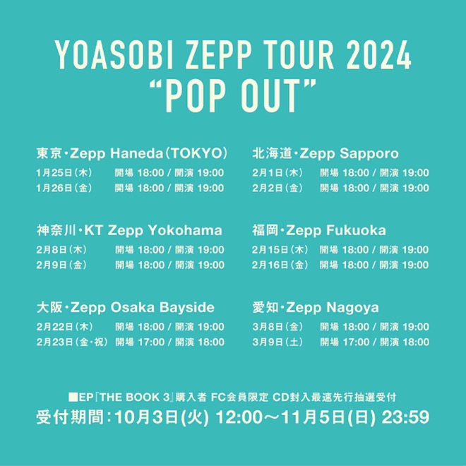 作品には、2024年1月より国内6ヶ所12公演を回る自身初のZeppツアー<YOASOBI ZEPP TOUR 2024 “POP OUT”>のチケット最速先行抽選受付シリアルナンバー(FC会員限定)が封入される。