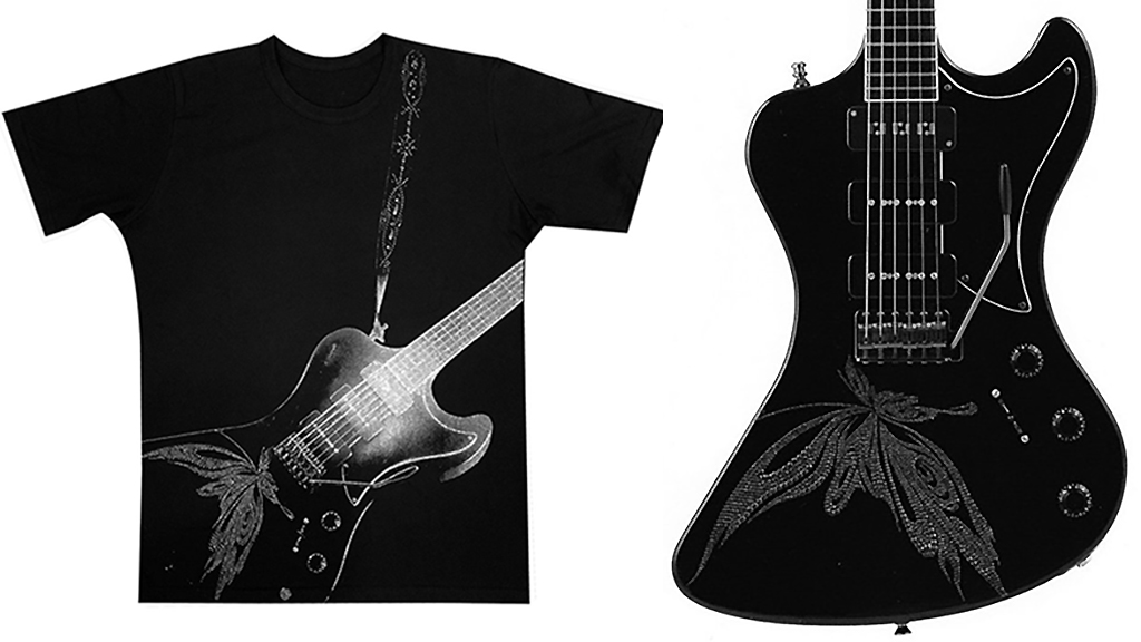 ──本番で使うギターは1本ものなので、失敗は許されない。だから、そのためのテスト用ギターを何本か用意して、図面を引いてサンプルギターに一回貼って、塗装を剥がして打ち付けるという大変な工程があるんですね。さっきも話がありましたが、ステージ上でギターをぶっ壊すような人が激しく使っても、剥がれることなくキラキラとスワロフスキーが輝いていると。