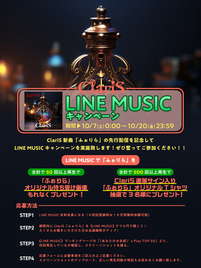 さらに、新曲「ふぉりら」先行配信に合わせて、LINE MUSICキャンペーンも開催。『「ふぉりら」オリジナル待ち受け画像』や『ClariS直筆サイン入り「ふぉりら」オリジナルTシャツ』がプレゼントされるといったスペシャルなキャンペーンとなっている。キャンペーン期間は、10月20日(金)まで。