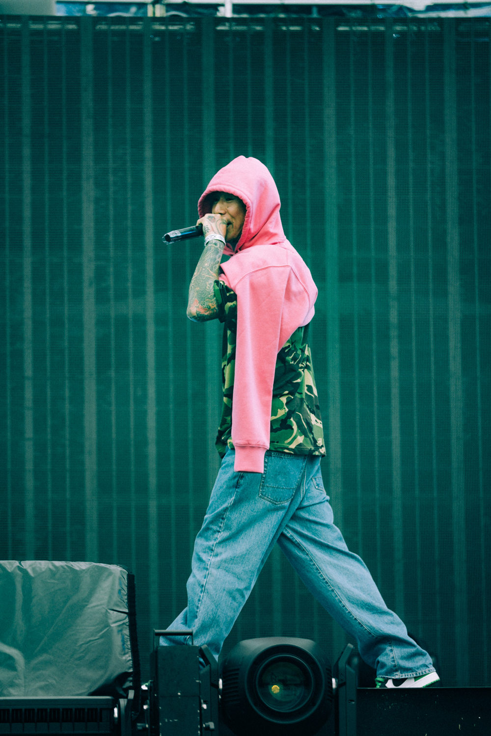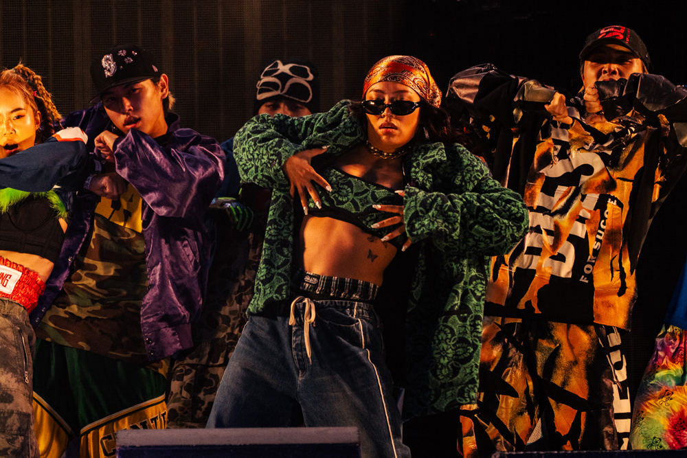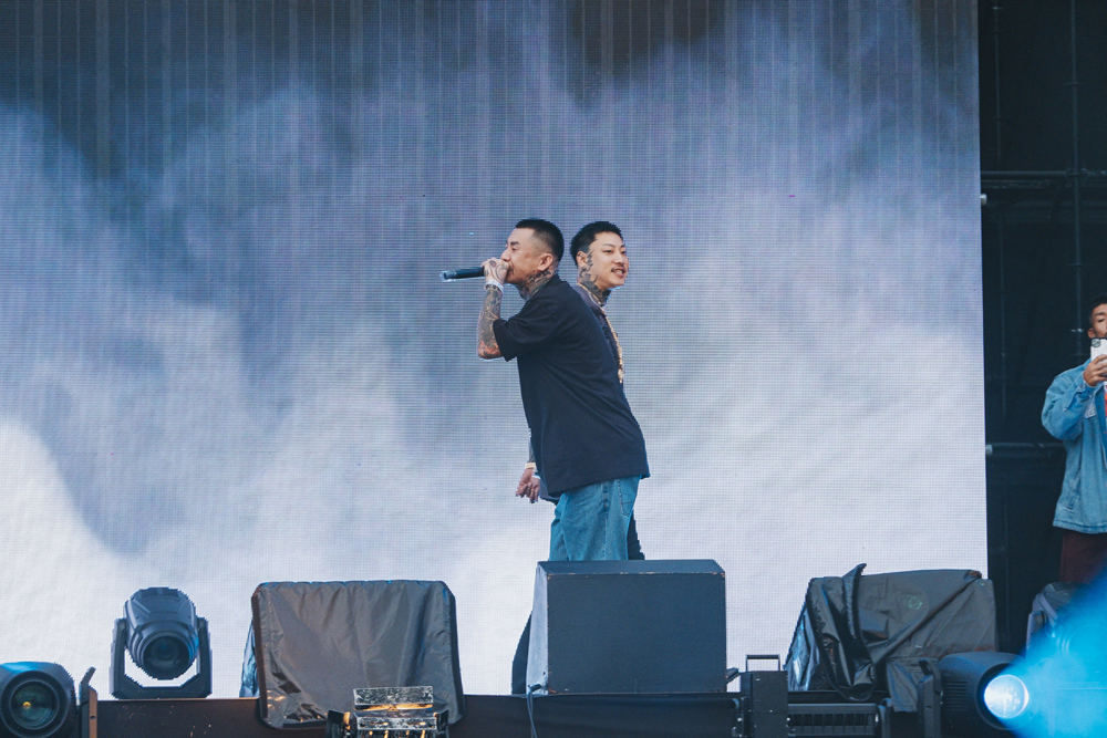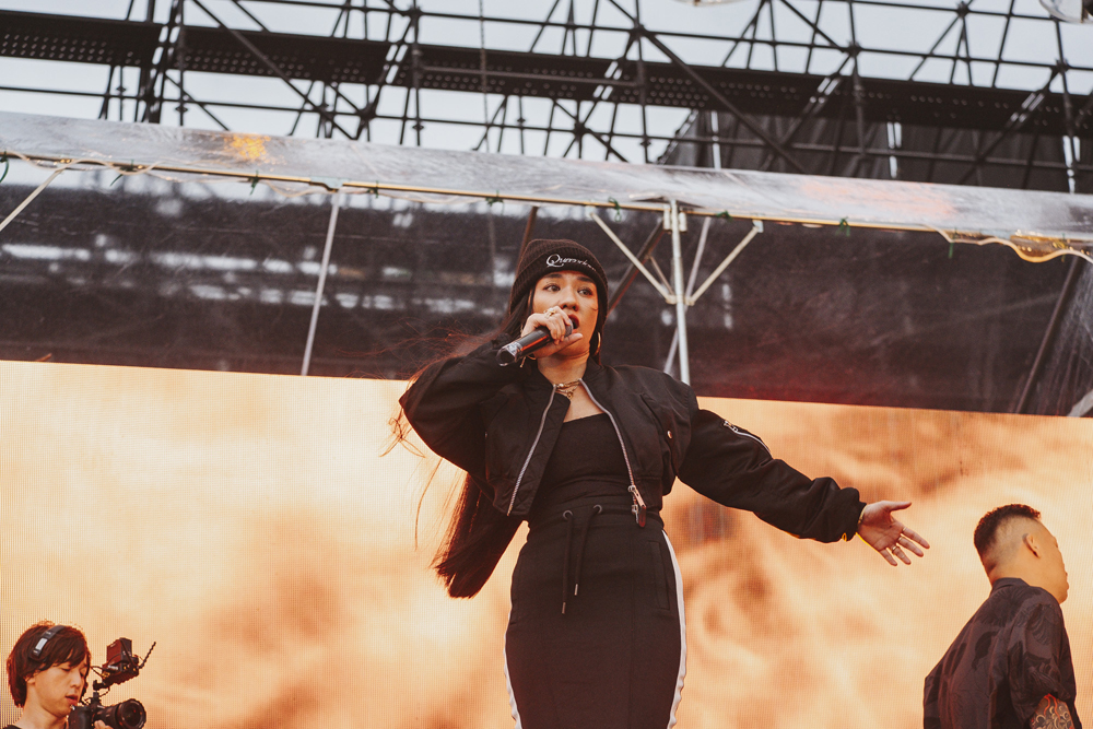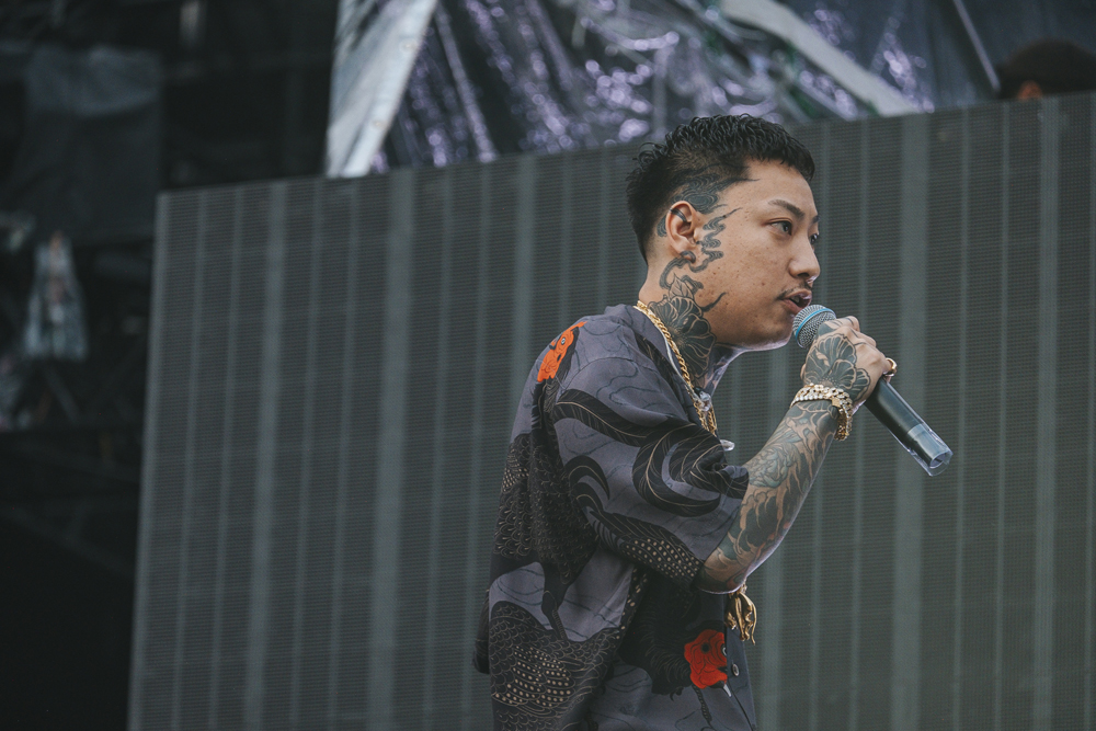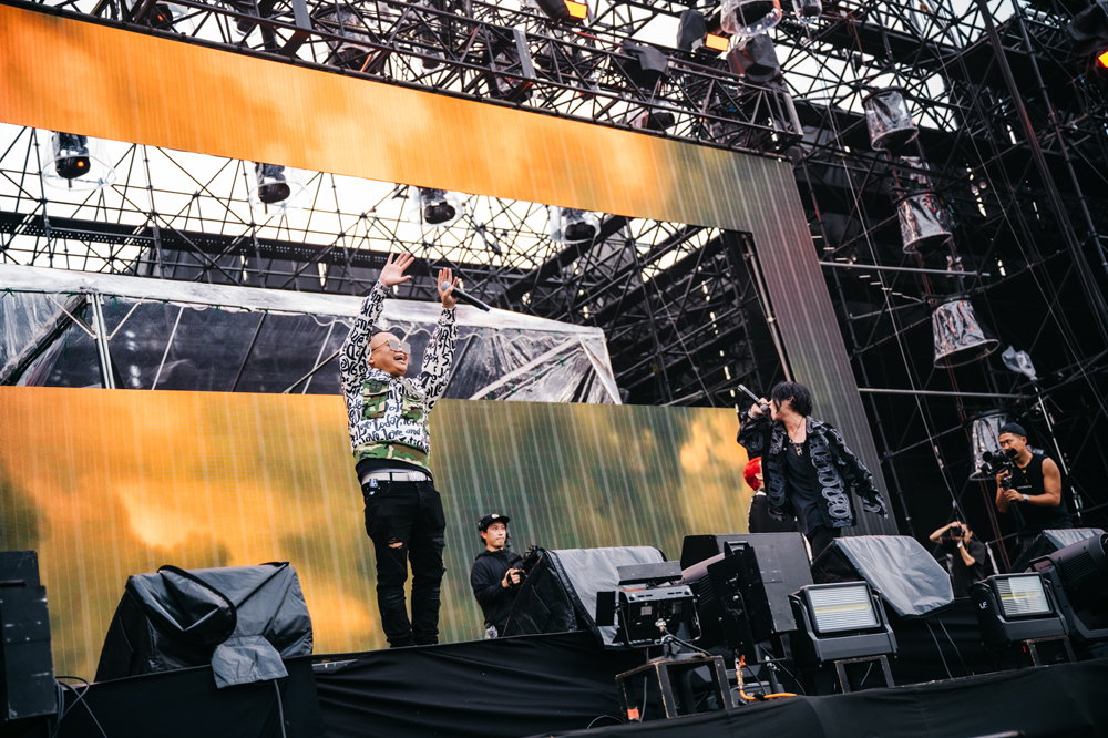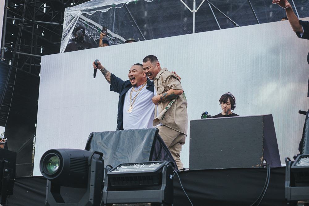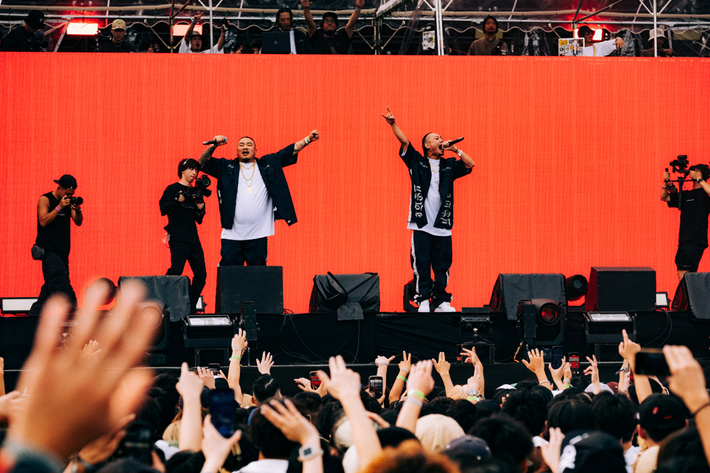 続くジャパニーズマゲニーズのステージでは、紅桜がサプライズ登場。マイクを包み込むような姿勢から放つ「悲しみの後」のブルージーな歌声はあまりにも沁みた。オーディエンスも「おかえり!」と叫ぶ。J-REXXXも加わり4人で披露した「最後の一本」は、この日のハイライトとも言えるほどの大合唱が起こった。一転して、ふいに「BUDS MONTAGE」のあのイントロが流れた瞬間に思わず鳥肌が立ったが、オーラに圧倒されるようにあたりに不思議な静けさすら漂っていたのが舐達麻のパフォーマンスだ。その後は、「ANGELA」ではANARCHYが、続く「OUTLAW」ではなんとAwichが登場するというスペシャルなステージでスマートに魅了すると、疾風の如く帰っていった。