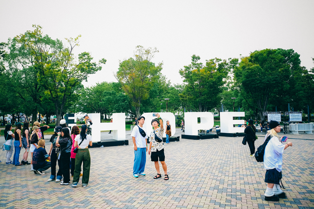 イベントもいよいよ終盤を迎えると、ヘッドライナーたちのステージに、会場の熱気は天井知らずの高まりを見せ続けていった。「夜を使い果たして」「タイムマシーンにのって」という代表曲に加えて、「お隣さんより凡人」では日本語ラップの名フレーズを繋いだスペシャルバージョンを披露したPUNPEE、ラップも歌もダンスもステージ演出もエンターテイメント性が抜群だったちゃんみな、AK-69との「Bussin’」ののちにAK-69との2マンライブを日本ガイシホールで開催することもアナウンスされ更なるステップアップを予感させた¥ellow Bucksという、それぞれのベクトルからシーンを牽引しているアーティストならではの凄みがあった。そして大トリは、BAD HOP。<FUJI ROCK FESTIVAL ‘23>以来となるバンドセットを披露し、そのステージ上では、解散ライブの開催場所を東京ドームと発表した。シーンへの登場からずっと、ヒップホップというカルチャーを日本で押し広げてきたBAD HOPが大切な発表の場に選んだのも、<THE HOPE>だった。